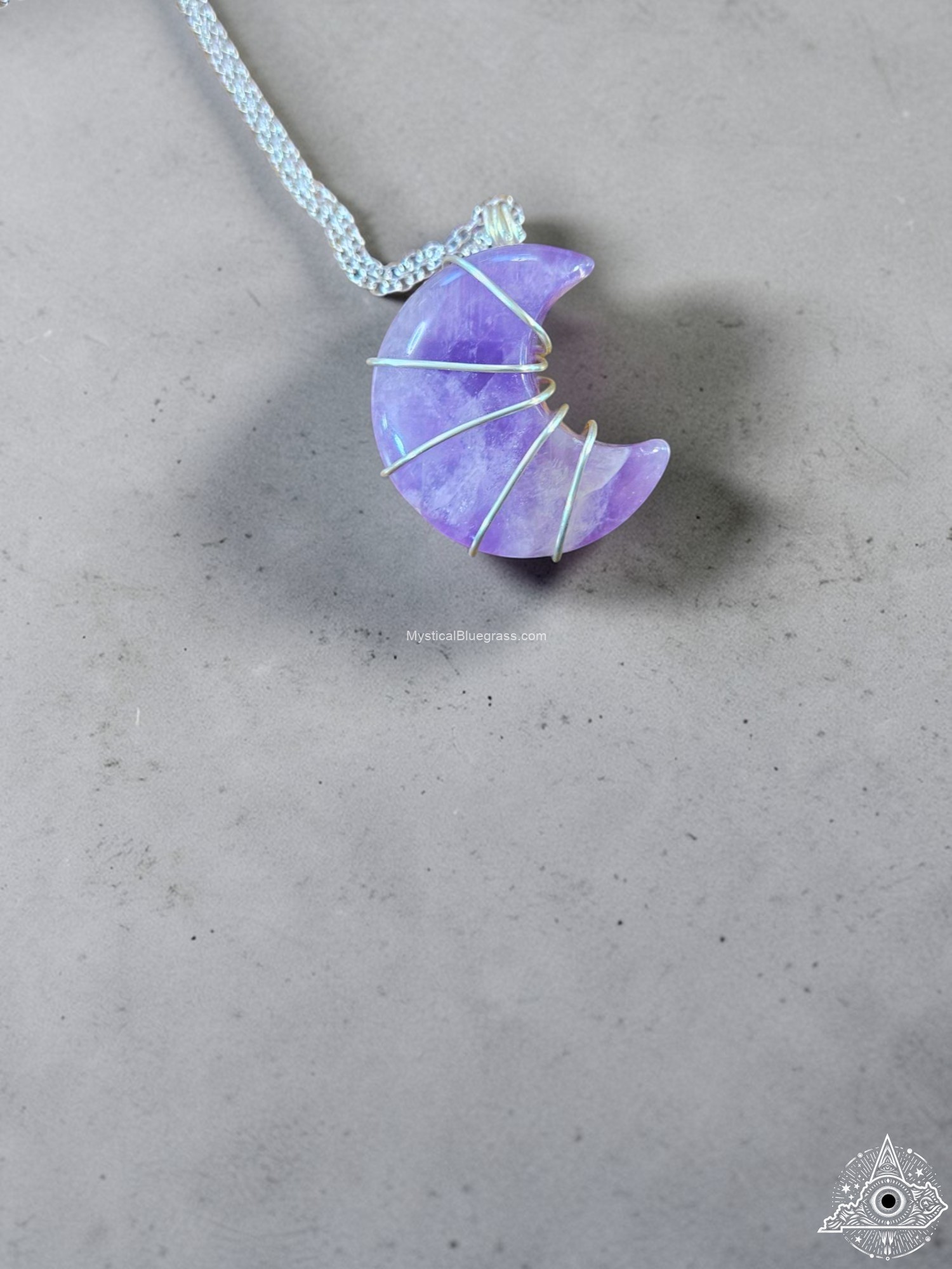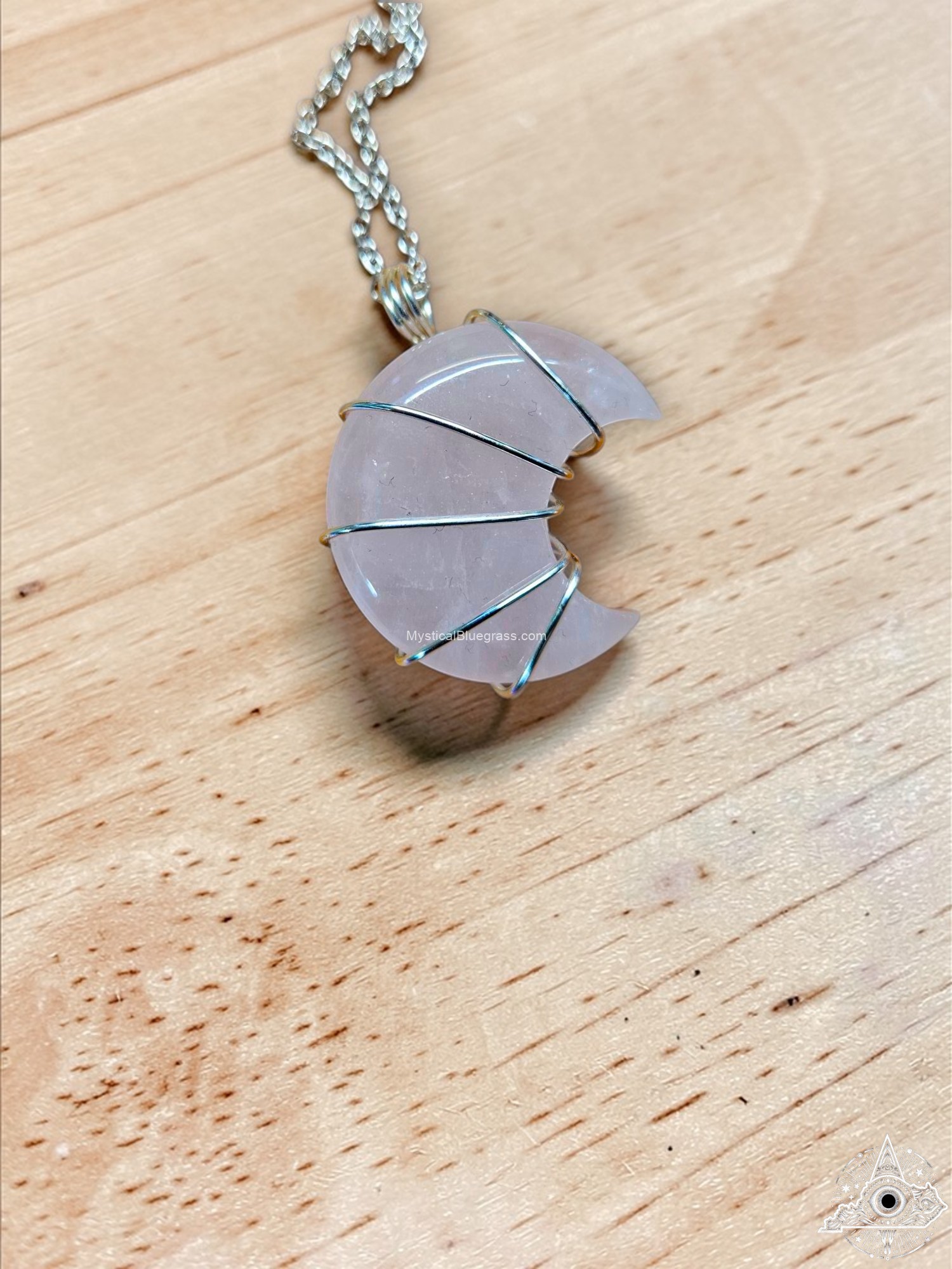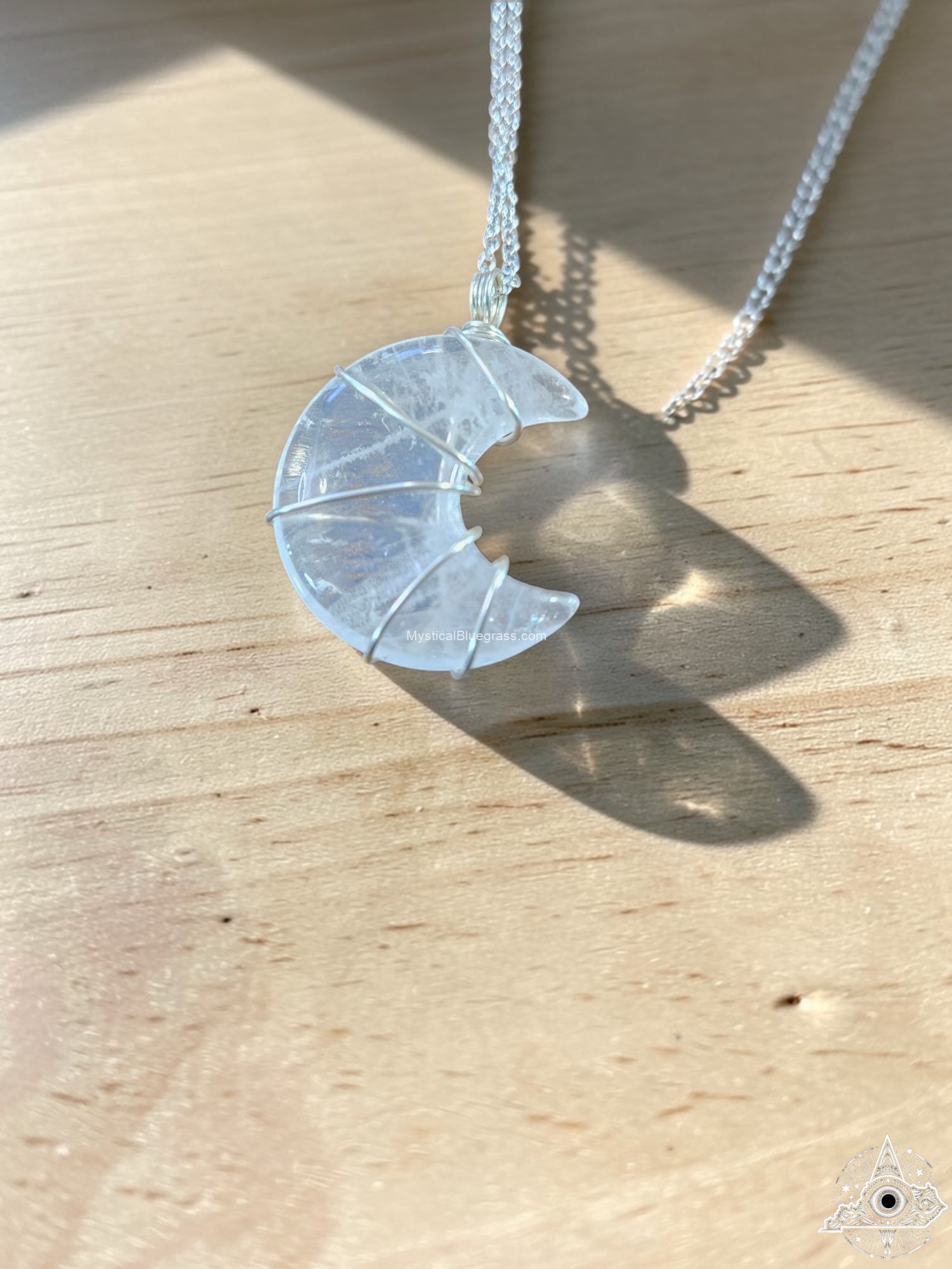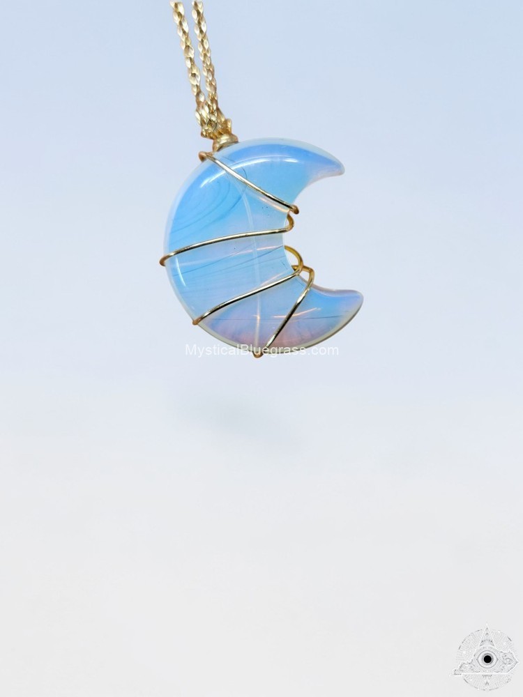 Channel the mystical energy of the moon with this beautifully handcrafted crescent moon necklace. Each pendant is lovingly wire wrapped by hand, creating a unique piece that captures light and turns heads. The translucent crystal stone radiates a soft, ethereal glow that adds enchanting beauty to any outfit.